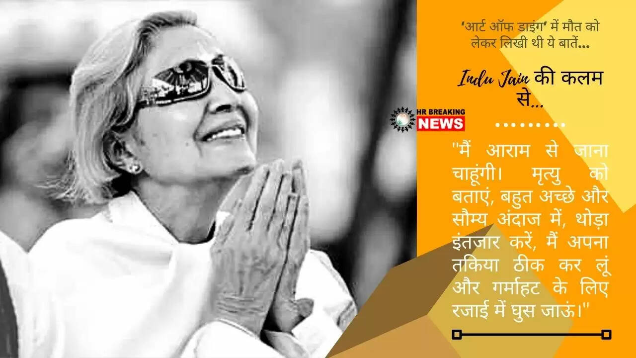 HR BREAKING NEWS. मृत्यु निश्चित है। फर्क है आपके नजरीए का। आप इसे कैसे देखते हैं। मौत के पड़ाव को एक नए एक्सपीरियंस के रूप में देखने वाली टाइम्स ऑफ इंडिया मीडिया समूह की चेयरपर्सन इंदु जैन का गुरुवार को निधन हो गया। वे 84 साल की थीं। उन्होंने वर्षों पहले ‘आर्ट ऑफ डाइंग’ को लेकर एक पत्र लिखा था और कहा था कि उनकी मृत्यु पर शोक नहीं, उत्सव मनाया जाए। यह मृत्यु को लेकर उनकी अलग सोच बताती है। ये चिट्ठी उनके निधन के बाद जारी की गई है। इसमें जीवन और मृत्यु को लेकर उनकी क्या सोच थी, उसे बहुत सुंदर शब्दों में बताया गया है। हम अपने पाठकों के लिए उसका रूपांतरण यहां पर प्रस्तुत कर रहे हैं।