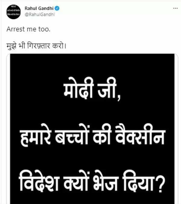 HR BREAKING NEWS. कोरोना वैक्सीन पर छिड़ा पोस्टर विवाद अब राजनीतिक मुद्दा बन गया है। कांग्रेस नेता राहुल गांधी भी अब इस मामले में शामिल हो गए हैं। उन्होंने रविवार को सोशल मीडिया पर वह पोस्टर शेयर किया, जिस पर लिखा है- मोदी जी, हमारे बच्चों की वैक्सीन विदेश क्यों भेज दिया? इसके साथ ही राहुल ने लिखा है- मुझे भी गिरफ्तार करो। राहुल ने ऐसा इसलिए कहा है क्योंकि, ये पोस्टर चिपकाने पर दिल्ली पुलिस ने शनिवार को 25 लोगों को गिरफ्तार कर लिया था। राहुल गांधी और कांग्रेस की महासचिव प्रियंका गांधी वाड्रा ने ट्विटर हैंडल पर इस पोस्टर को अपनी प्रोफाइल पिक्चर भी बना लिया है।
